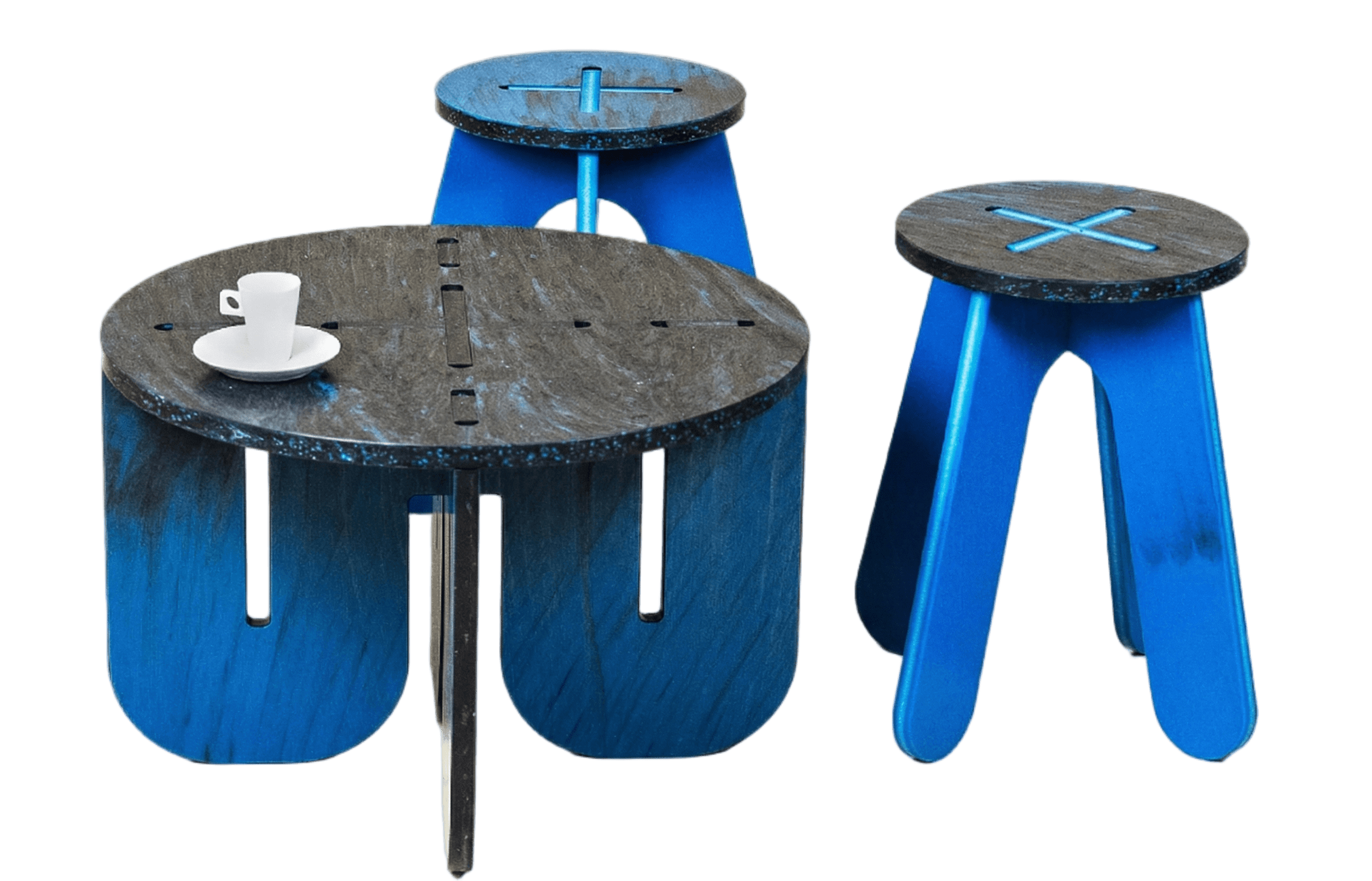 A year and a half later, with the support of our partners (FHNW, Upboards and AWZ) and numerous prototypes, the BLU stool was born—an innovative design that requires no glue or screws. We made plenty of mistakes along the way but adapted the design based on our learnings. Our dedication eventually paid off, and we were honored to be invited to showcase our product at the World Economic Forum (WEF)! It marked the start of a long list of exciting events. And today, the BLU stool is available for preorder, reflecting our team's creativity, persistence, and commitment to sustainability.